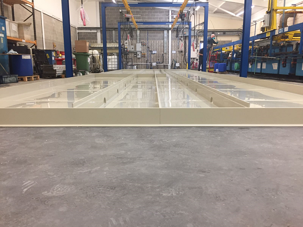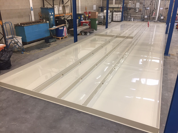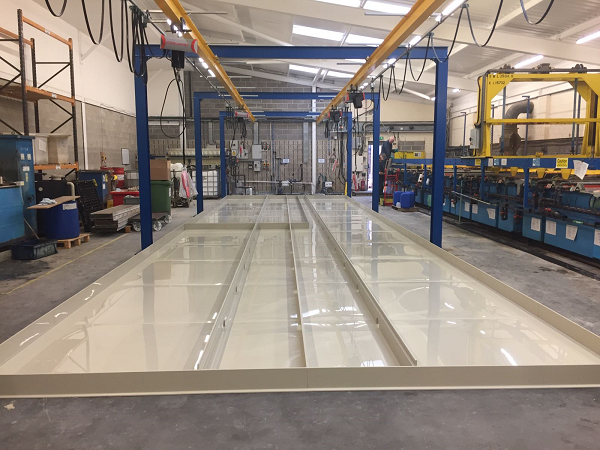 Large Polypropylene Bund 17m x 5m for a plating line area, prior to the installation of tanks and fume extraction etc. All parts manufactured in our Sheffield workshop then assembled and welded on the customers site.